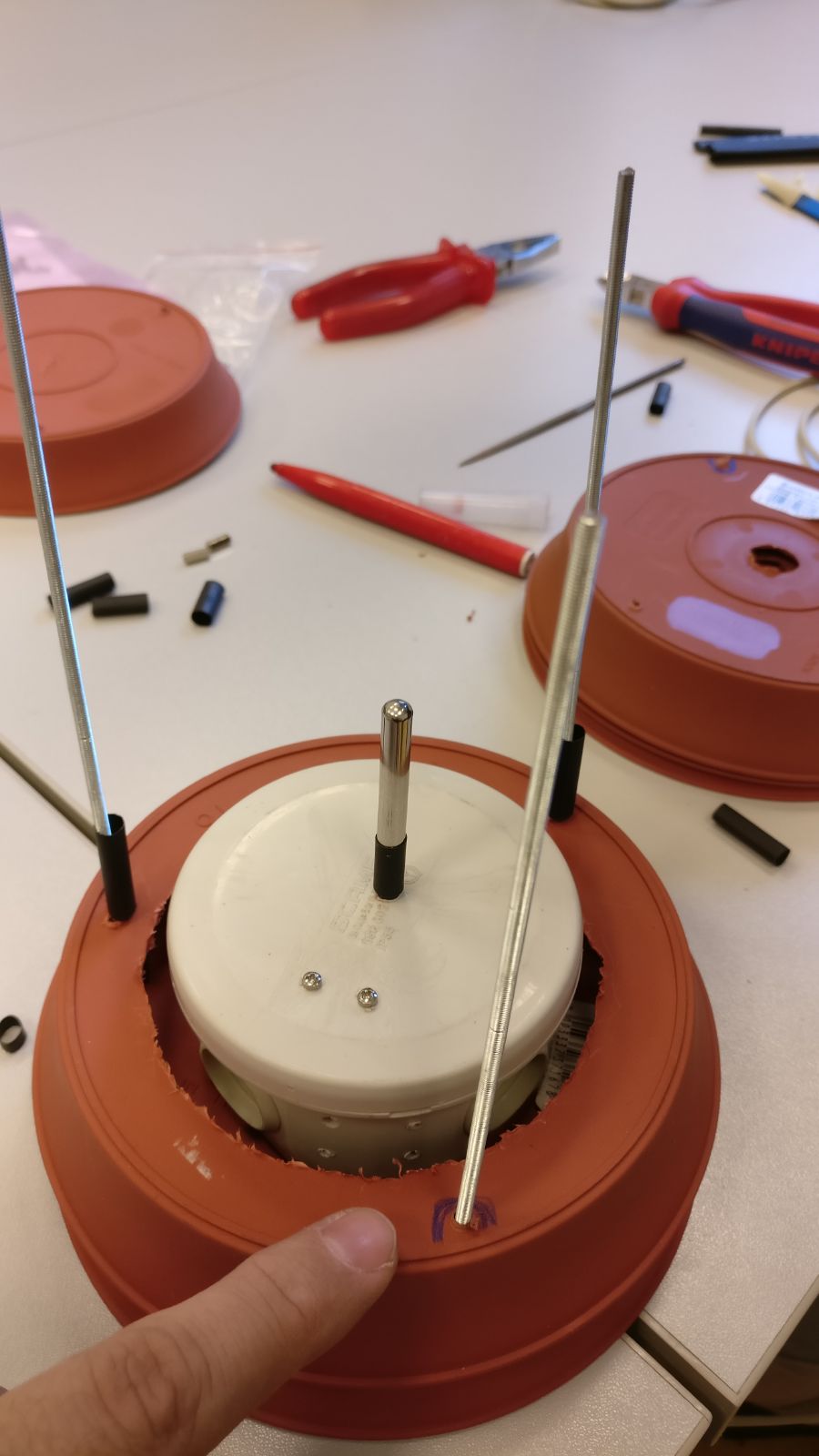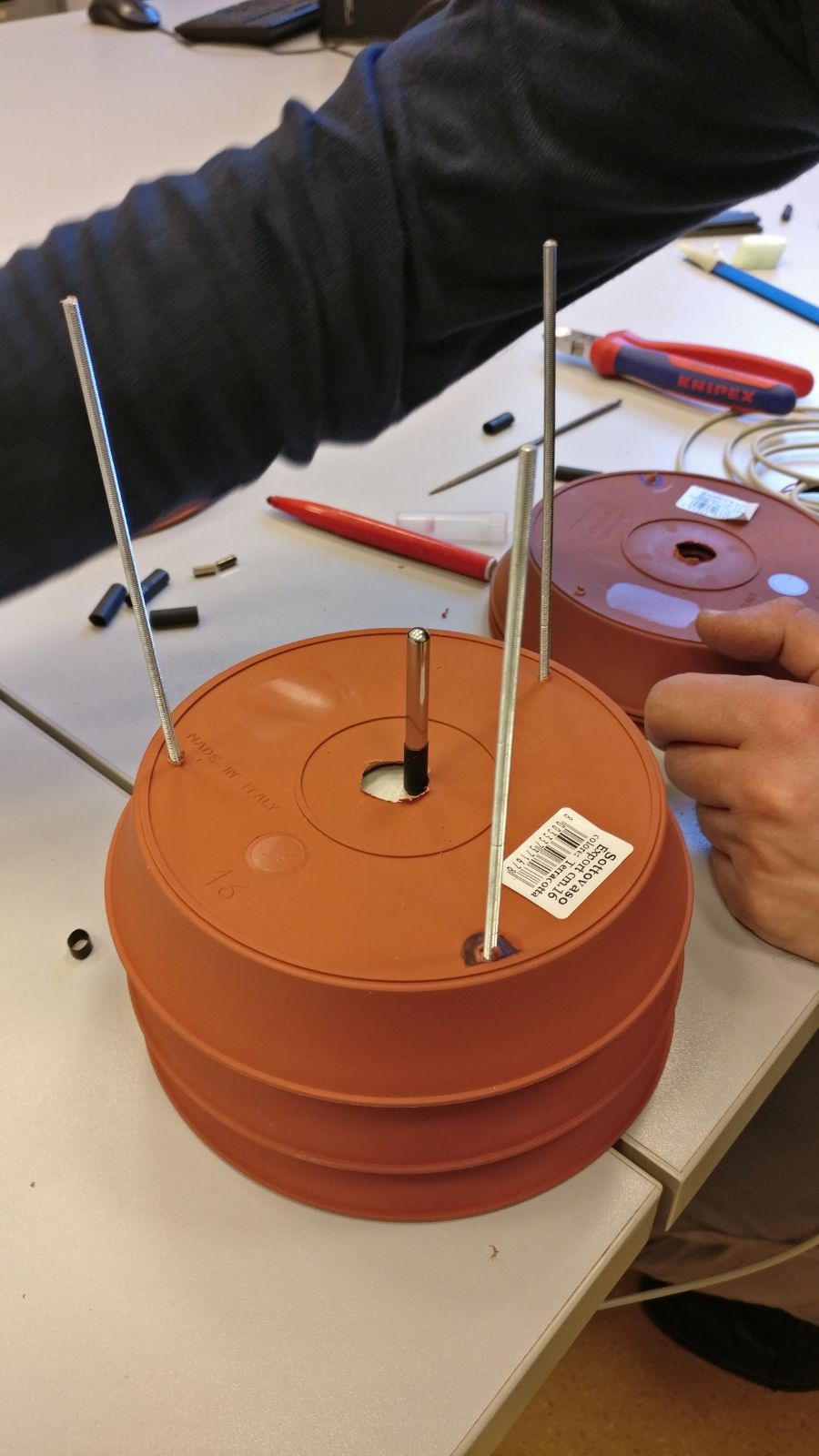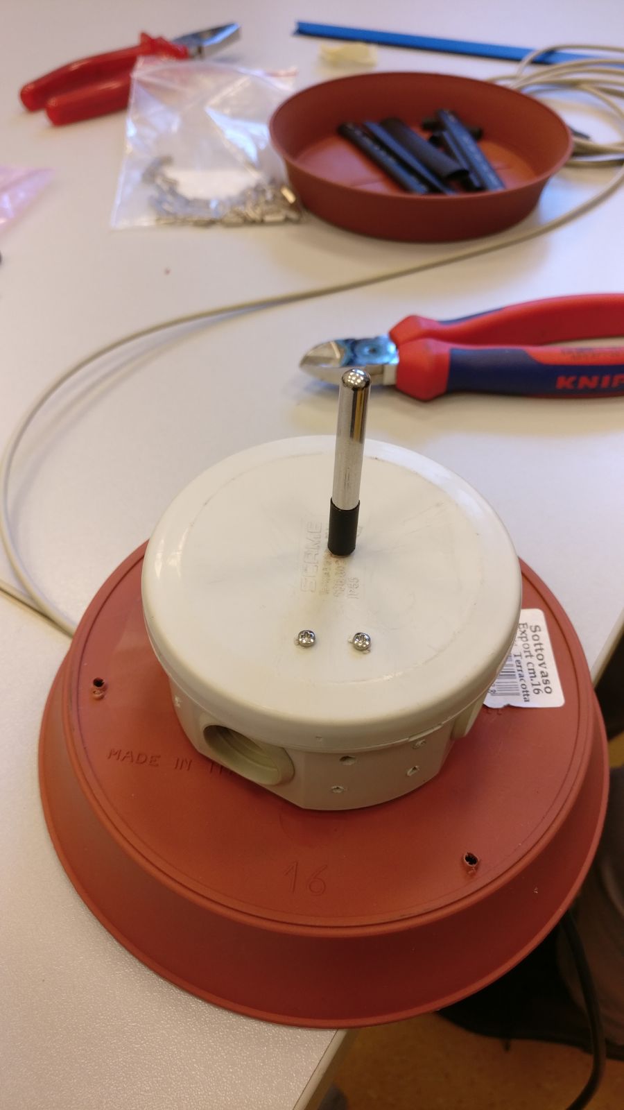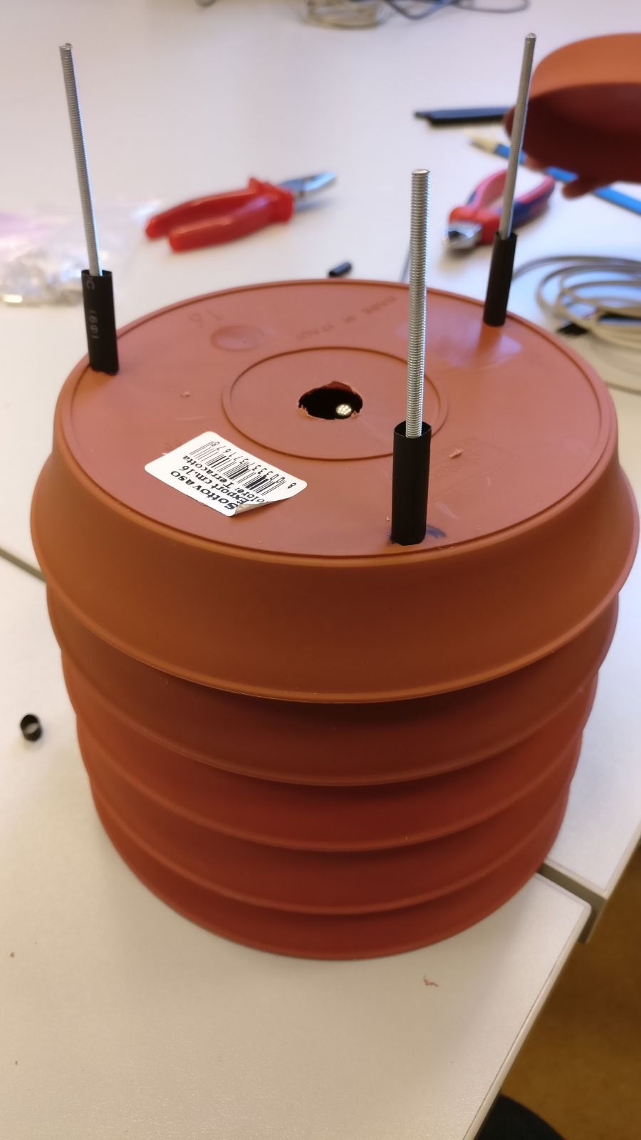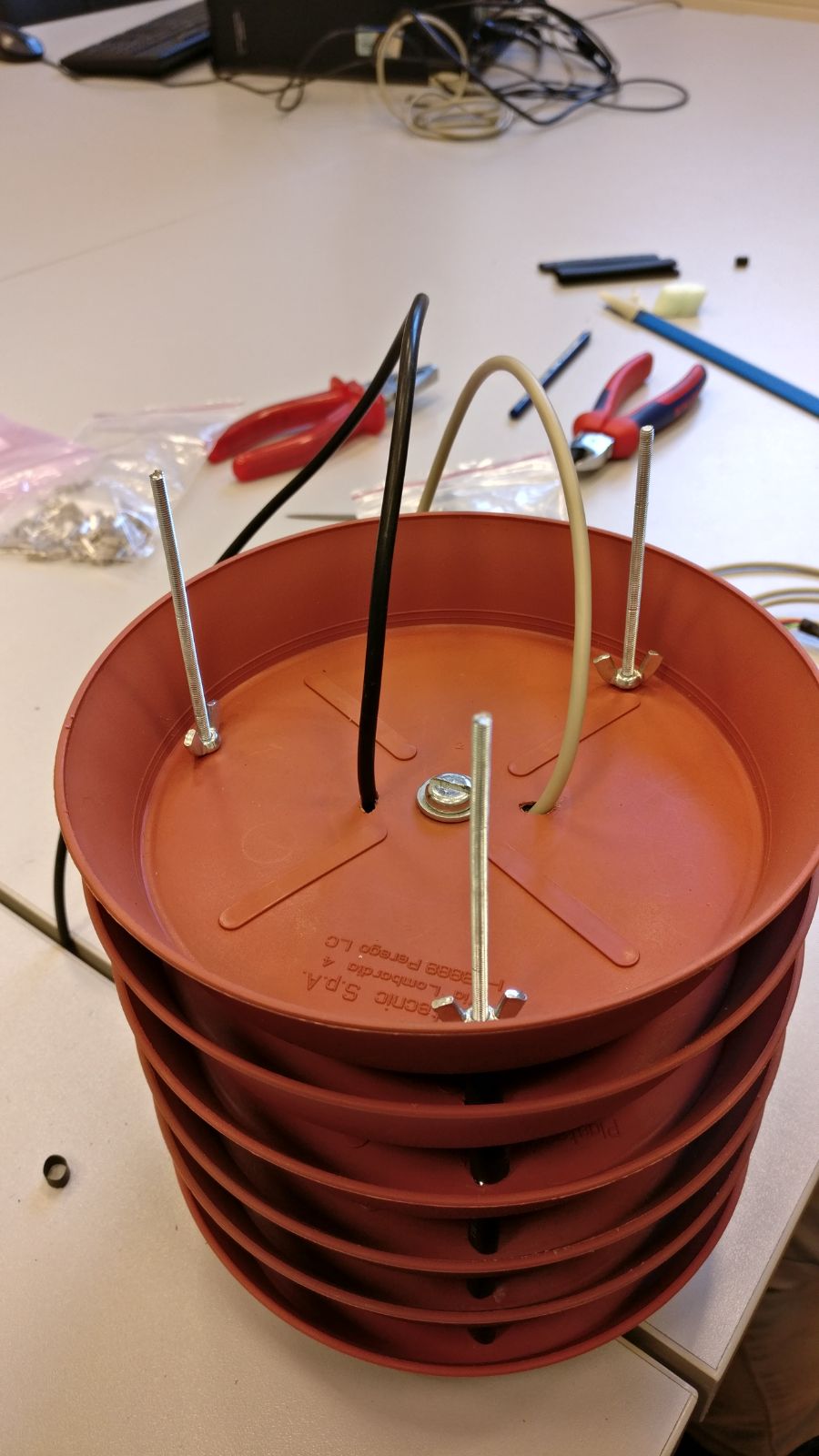 Prepare six plant saucers (better if they are already white otherwise you should paint them) and a small junction box. Three threaded rod with 3 mm diameter, bolts and spacers accordingly.
