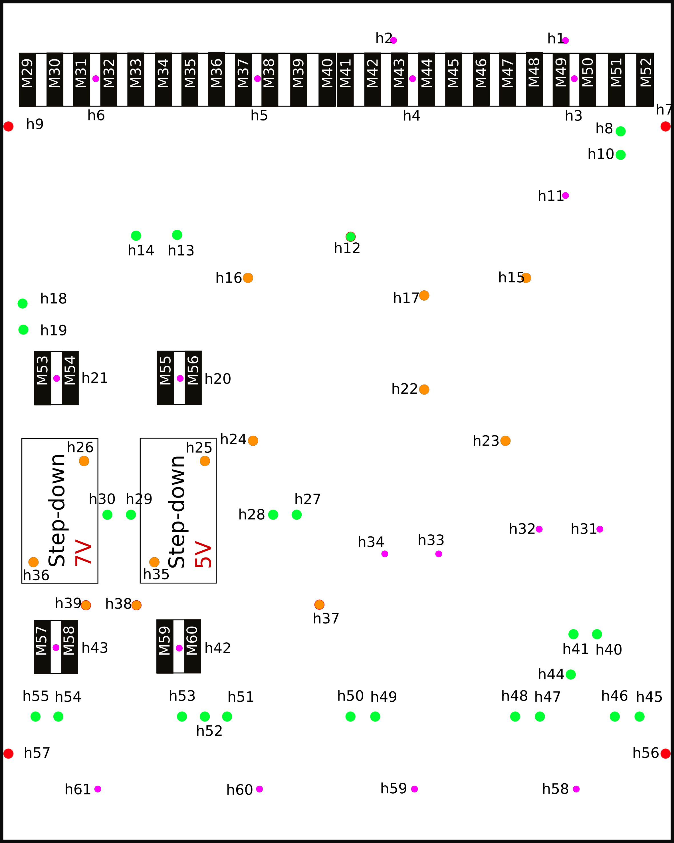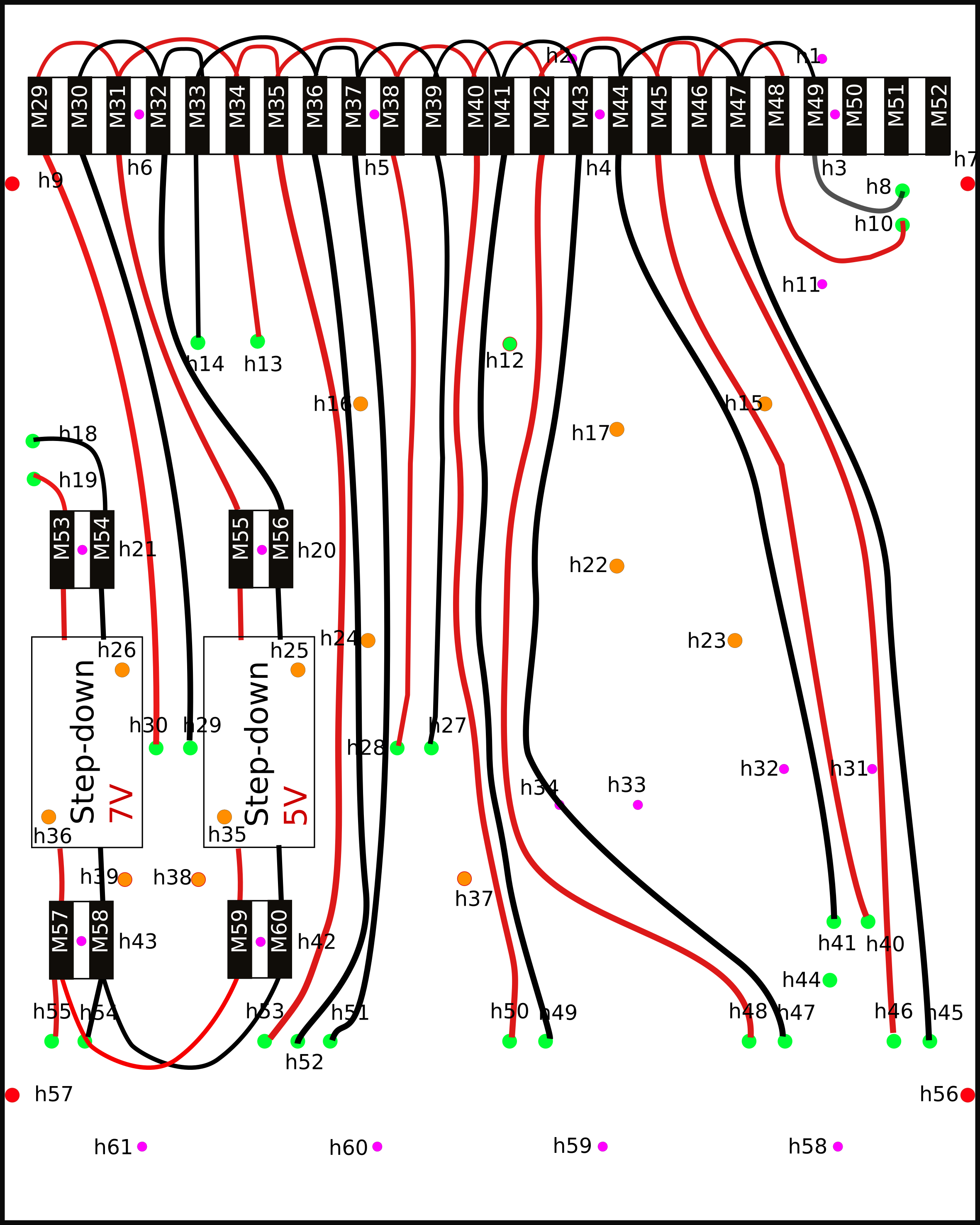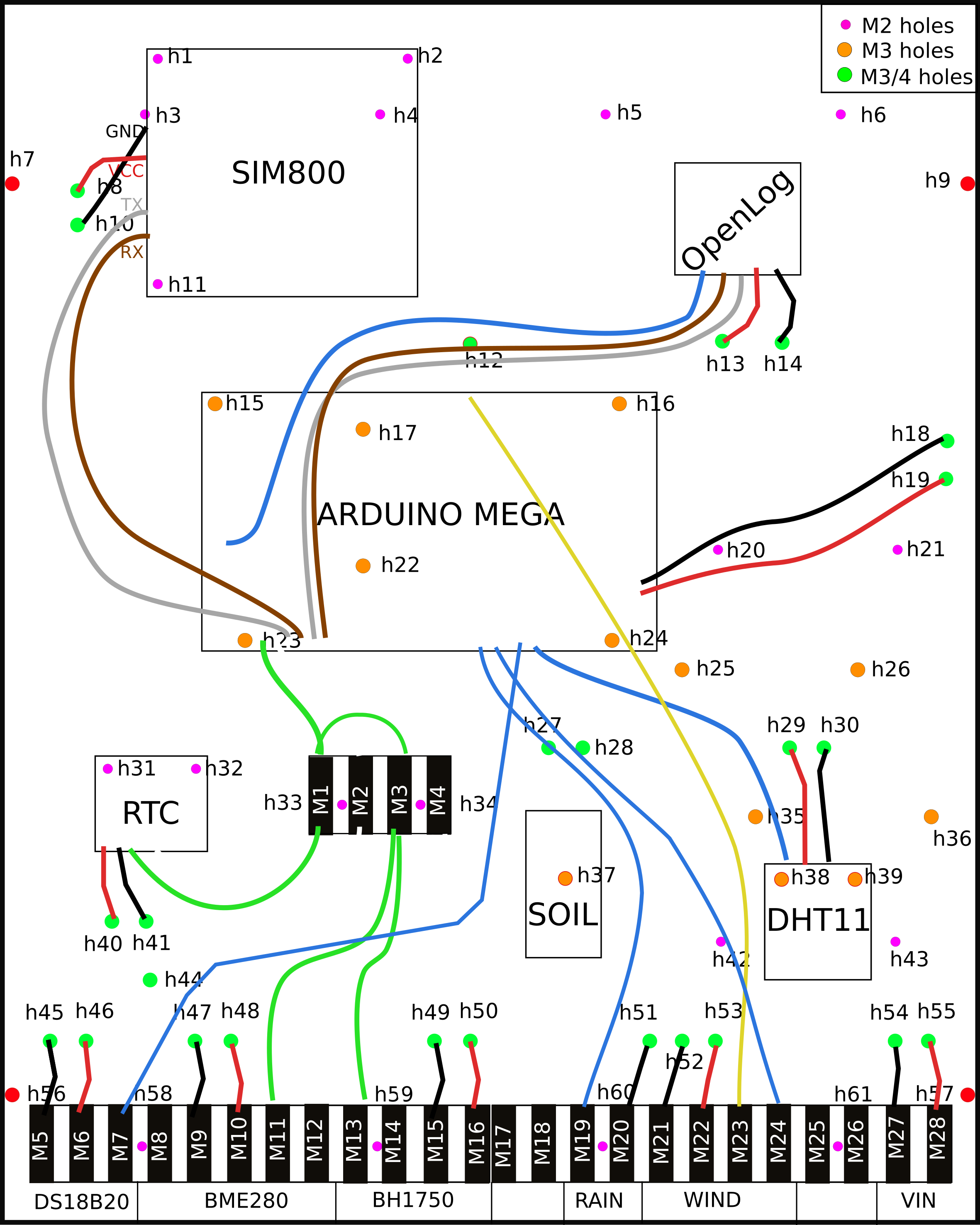 Refer to the following hookup schemas to locate holes, components and connectors.
