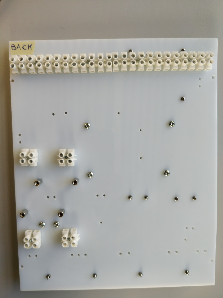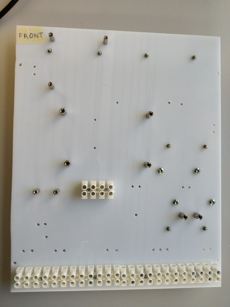 Once the cables on the back and from the front to the back side are mounted, use the voltmeter to check the voltages. Remember to switch on the current using the power adapter.