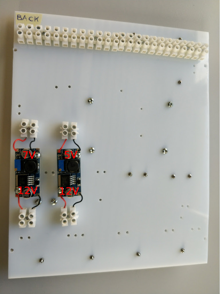 The voltage of the step-down output current is written on the rear side. Mount them according to the images in the step 1 and to the following image (read the voltage written on the back-side of the step-down). The 7V output step-down must be on the left and it is use to power the Arduino.