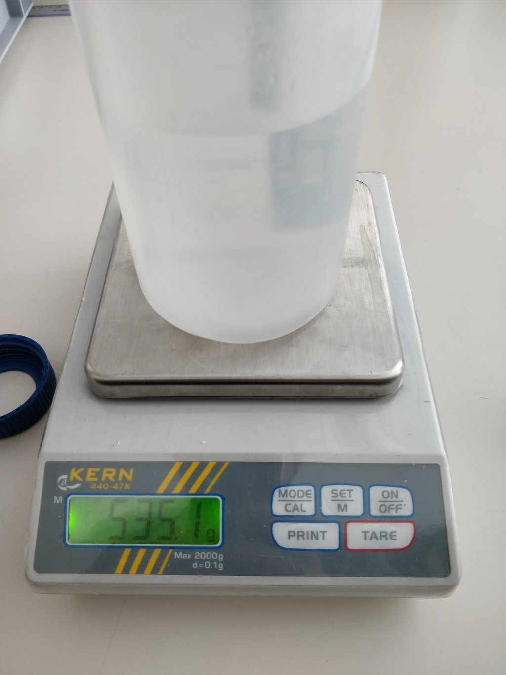 Fill the bottle with 53.5 cl of water (535 g).